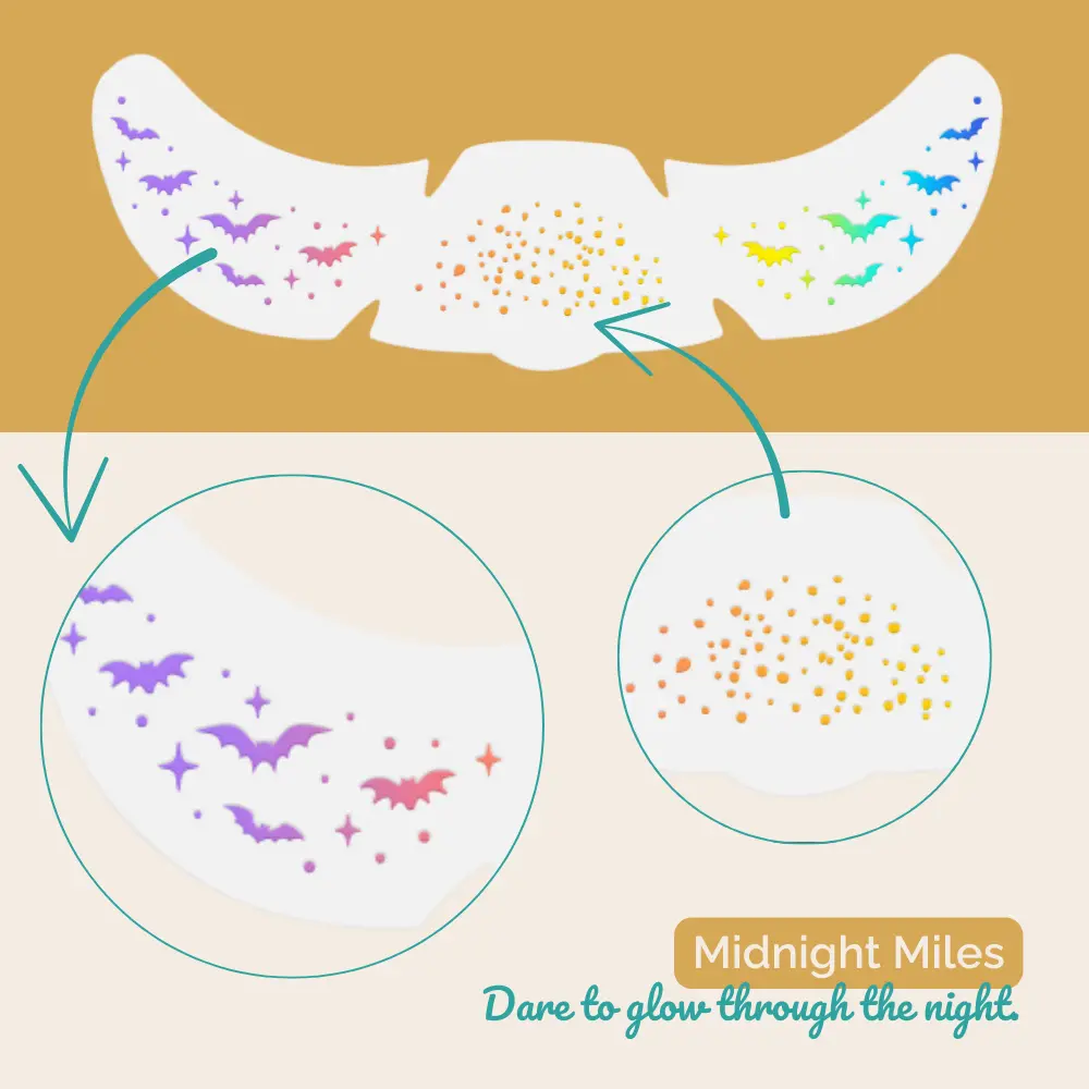 Freck Yeah Midnight Miles so tatuji za vse, ki raje tečejo (ali plešejo) ponoči. Holo netopirčki in iskrice, ki se prelivajo v mavrične barve pod soncem in odrskimi lučmi. Drzne, igrive in dovolj obstojne, da preživijo celo noč – in jutranjo vožnjo domov.